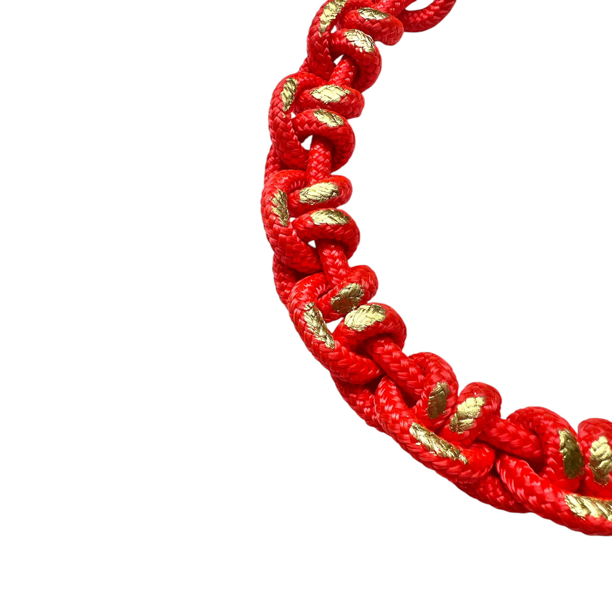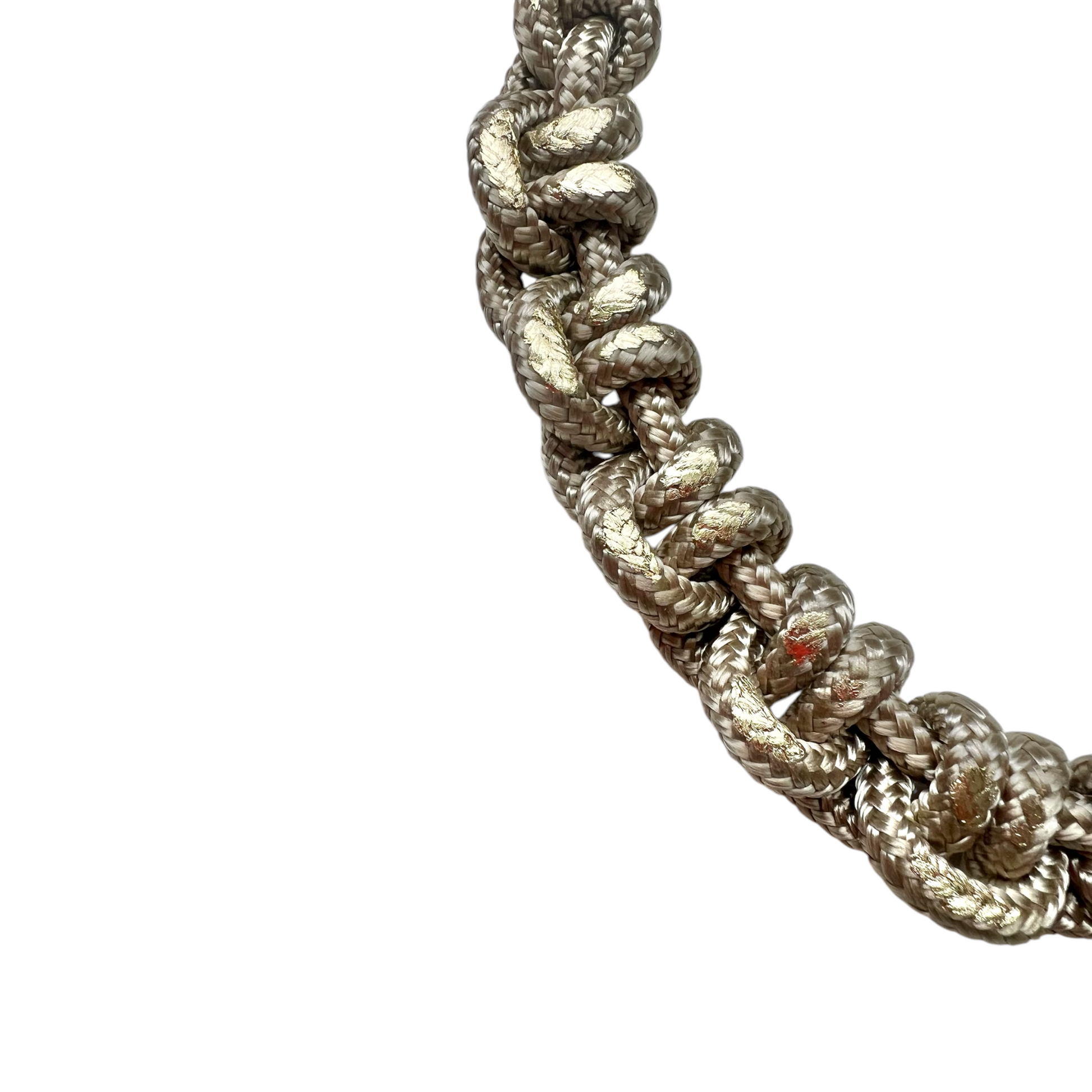 Elevate your style with Cat Donohue's signature Hitchknot necklace, where nautical utility meets high fashion. This bold statement piece transforms a classic maritime knot using premium nautical line, available in understated plain or dazzling foil appliqué designs. Luxurious 14K gold-plated brass hardware adds a lasting, elegant shine. Handcrafted with care, this versatile necklace embodies nautical-chic, perfect for adding a touch of adventure and refinement to any outfit.