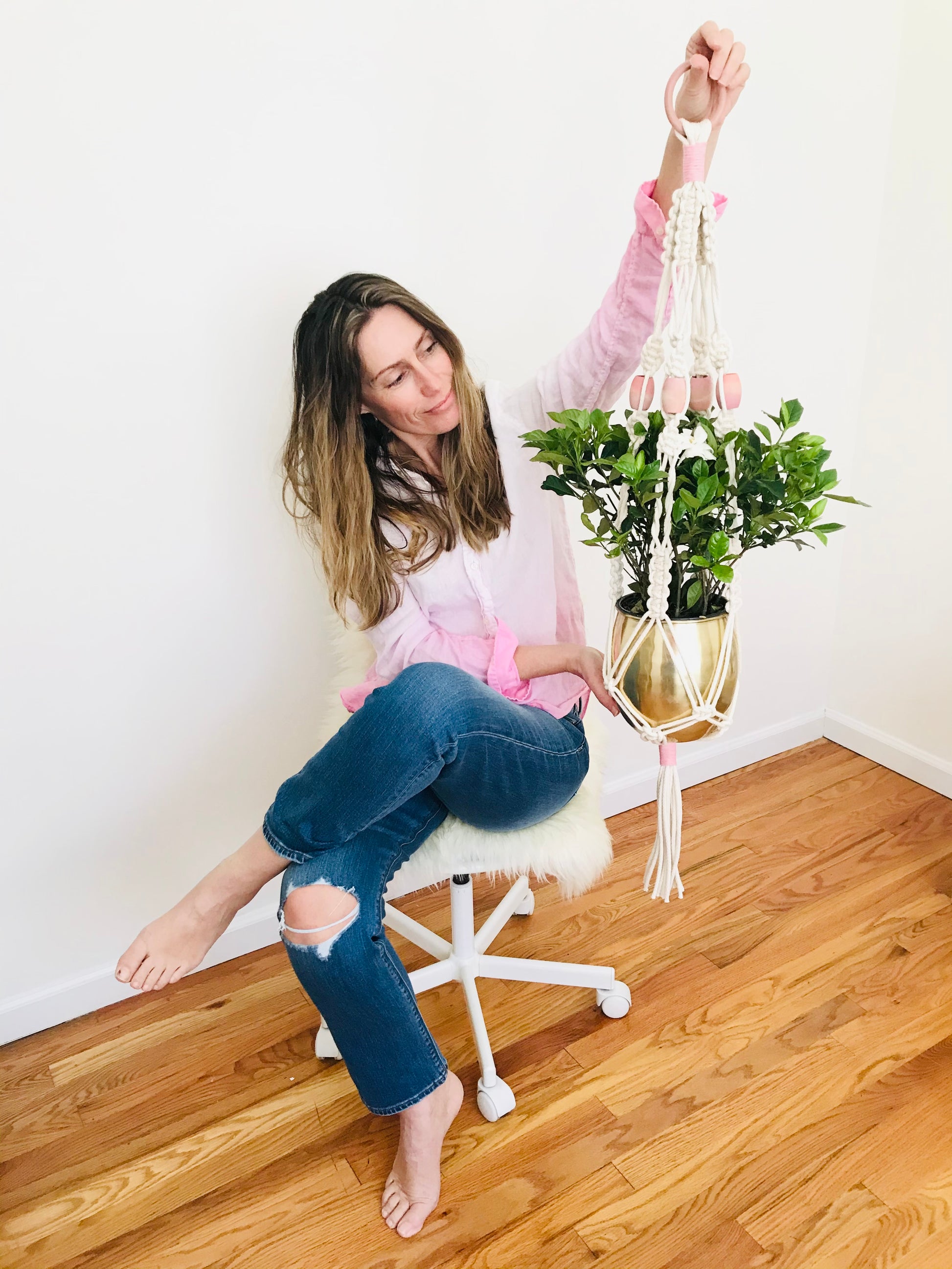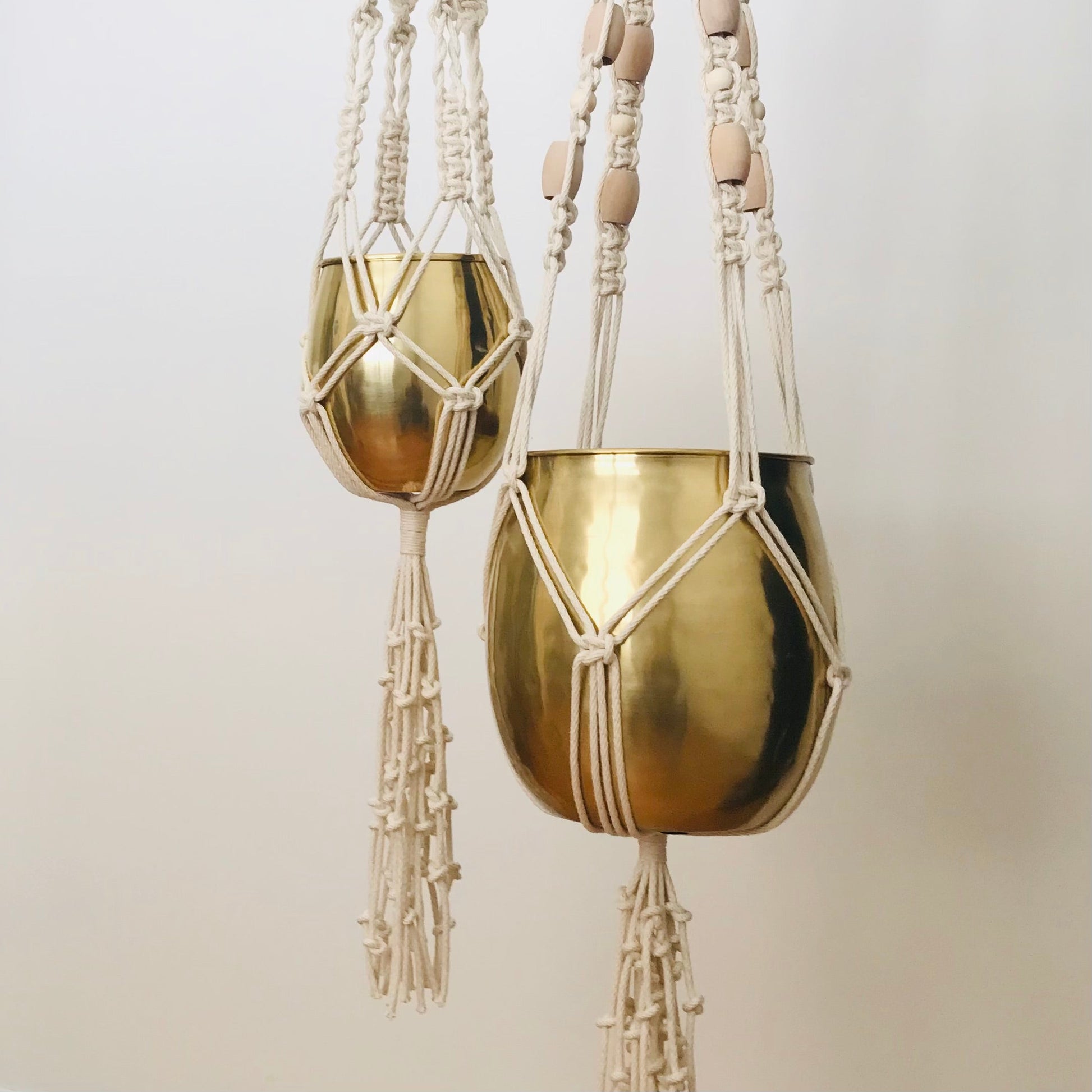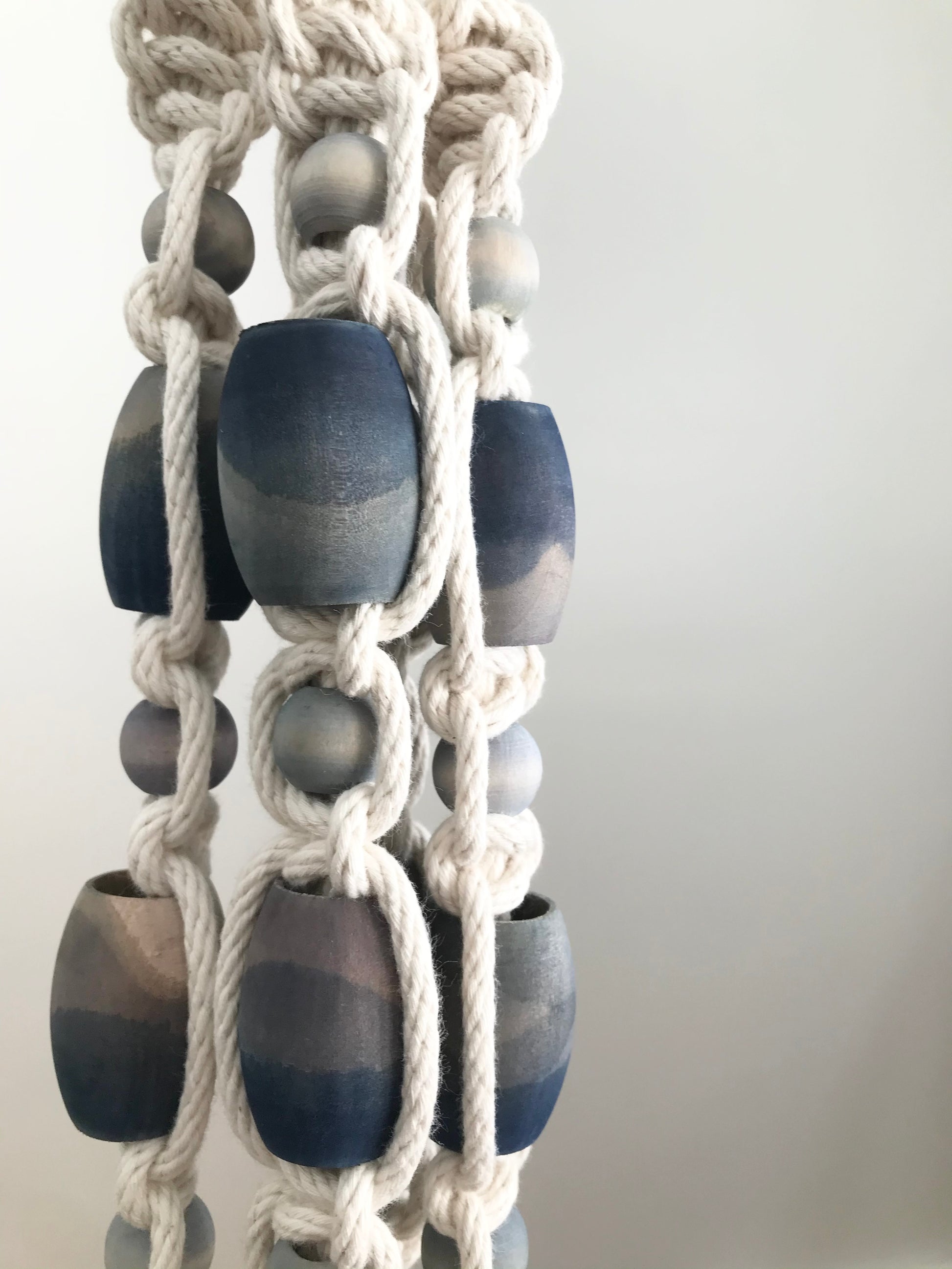 Plant kindness with these unique larger than life plant hangers made with nautical line and natural wooden beads. They can hang outside, however be aware that time and weather will fade the rope eventually. Maximum weight 200 lbs.